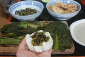おにぎりと、本漬けした高菜漬けの持ち帰りもありますので、ご自宅でもお楽しみください。