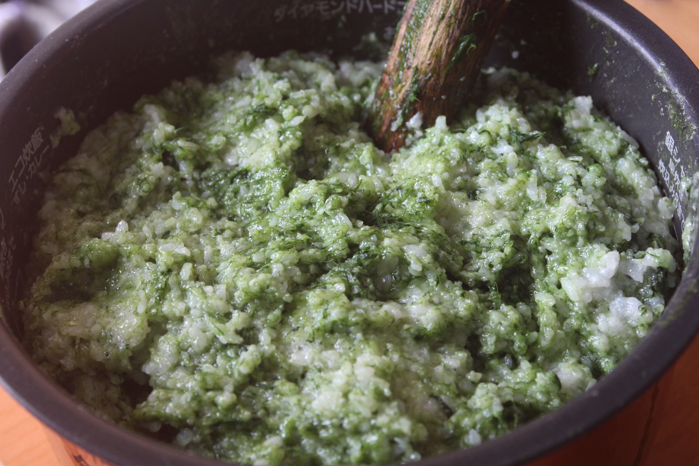 炊けたら、ヨモギペーストをいれて
